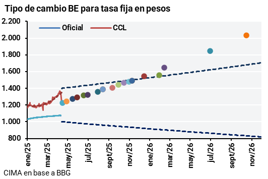 Considerando que el BCRA interviene en 1000 para la compra y 1400 para la venta, es poco probable que el tipo de cambio se ubique efectivamente en los extremos de la banda. Más bien, esperamos que la demanda se concentre en torno a los 1050 y la oferta en niveles cercanos a los 1350. En este contexto, consideramos que cada vez que el tipo de cambio se acerque a esos valores, podría configurarse una oportunidad. Creemos que, al menos por ahora (y posiblemente durante todo el año), conviene armar posiciones en pesos, sobre todo si el dólar está en la parte alta de la banda, arriba de $1250/$1300. Con la reciente suba del tipo de cambio oficial y una inflación de 3,7% en marzo, es difícil pensar que la inflación baje del 2% mensual en el corto plazo. En este contexto, y según los precios que se consigan, posicionarse en instrumentos CER de duración media (2026) nos parece una buena alternativa para la parte en pesos – sobre todo arriba de 9% de TIR-.
