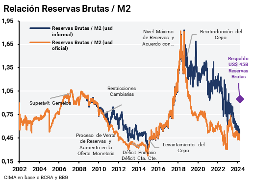 Bajo este escenario, la relación Reservas/M2 valuado a la banda superior ascendería a 0,95. Si bien se encuentra por debajo de los máximos históricos, representa una mejora significativa respecto de los niveles recientes, contribuyendo a reforzar la credibilidad del nuevo esquema en el mediano plazo.