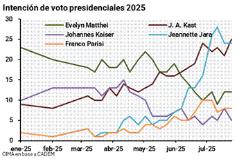 Chile en septiembre de este año tendrá elecciones presidenciales, y se opondrán 3 candidatos de la derecha (Matthei, Kast y Kaiser, nombrándolos de más centro derecha a extrema derecha), frente a la candidata de izquierda Jeannette Jara. La candidata oficial de izquierda, quien fue Ministra del Trabajo y Previsión Social de Chile durante el actual mandato de Boric, esta en una disputa cercana con el candidato Kast en las encuestas de intención de voto.