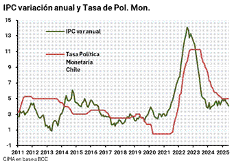 Las expectativas de la tasa de política monetaria según la encuesta del BCCh están en 4.25% para un año y dos años hacia adelante, lo que refleja la confianza en la convergencia de la inflación a la meta.