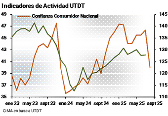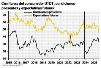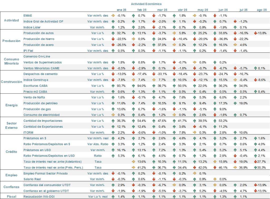 Todos los indicadores de actividad se han resentido durante los últimos meses, marcado por un aumento en la morosidad y el freno de los principales motores de crecimiento: el crédito comenzó a disminuir y los salarios se encuentran estancados hace varios meses. Este escenario explica en parte el resultado electoral adverso en PBA. La debilidad no se limitó al sector industrial (gran perdedor de este modelo), en agosto la confianza del consumidor se desplomó, las ventas de supermercados permanecieron estancadas a lo largo de 2025 y las expectativas a futuro de los consumidores mostraron una corrección significativa.