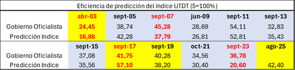 Tras las elecciones de la provincia de Buenos Aires se vió reflejado el pobre poder explicativo de las encuestas, sin embargo el índice de UTDT dio de forma perfecta la predicción en el porcentaje de votos. Es por ello, que analizamos cuál fue la capacidad predictiva de las elecciones nacionales en el pasado para los gobiernos oficilistas. Vemos que el índice tiende a subestimar el peronismo (color azul) y sobreestimo mucho las elecciones intermedias de Macri. Para este año, aunque aun falta el dato de septiembre, la predicción del índice es del 42.4% para el oficialismo.
