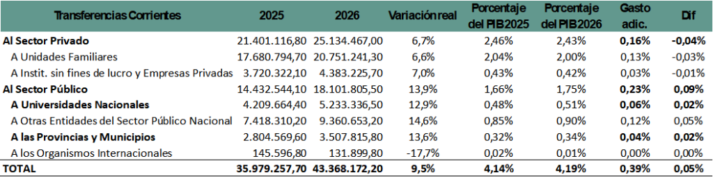 Respecto a las transferencias corrientes, el incremento del gasto que incluye las tranferencias a universidades y provincias, será del  0.05% del        PIB, y si no se cumple el supuesto de crecimiento será del 0.4% del PIB.