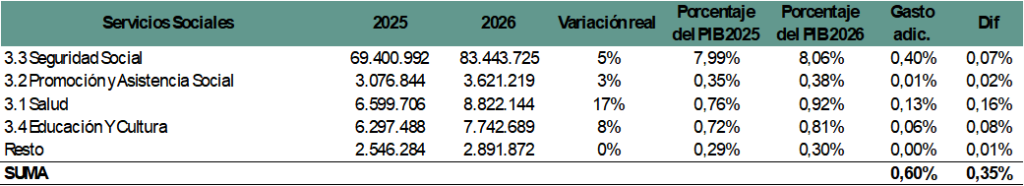 Con respecto a los gastos sociales, este tendrá un incremento real del 6%, siendo un gasto adicional del 0.35% del PIB (si se cumple el supuesto del crecimiento de 5% del PIB del gobierno). Si este último supuesto no se cumple, sería un 0.6% del PIB de gasto adicional (es decir, con una economía estancada).